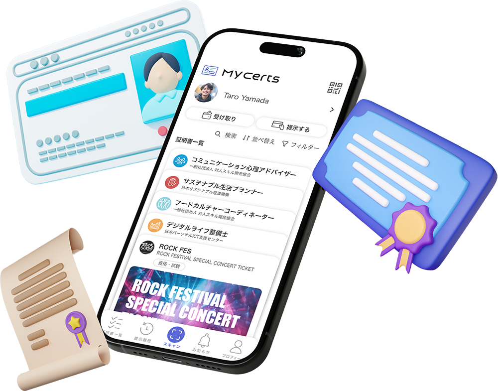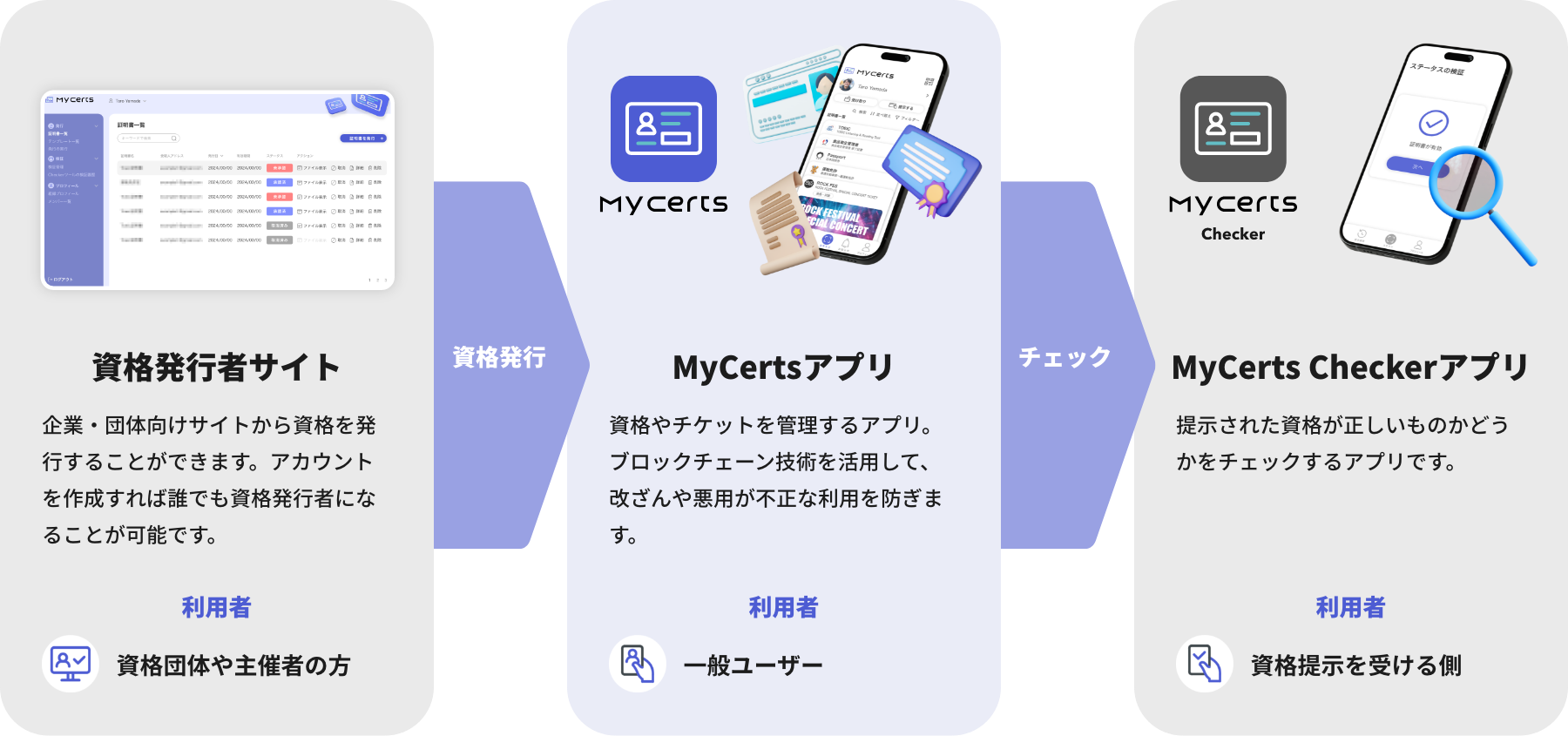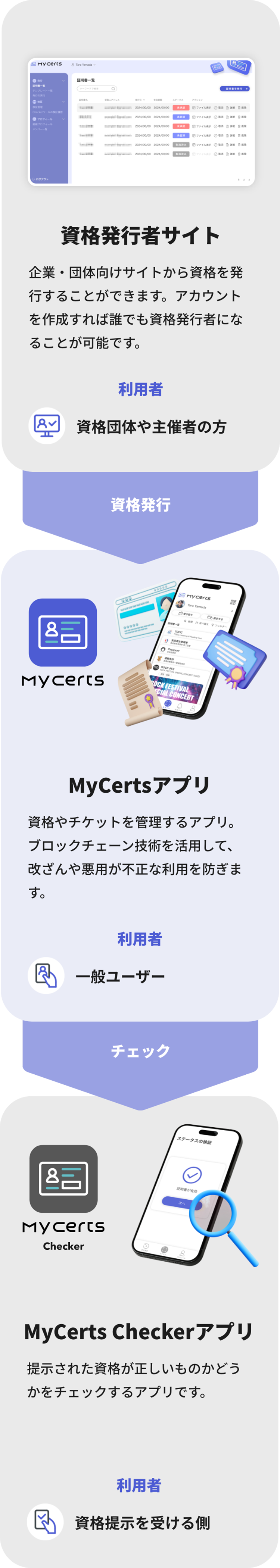 MyCertsアプリをはじめ、資格発行者サイトや資格チェックアプリまで。誰でも無料で利用いただけます。